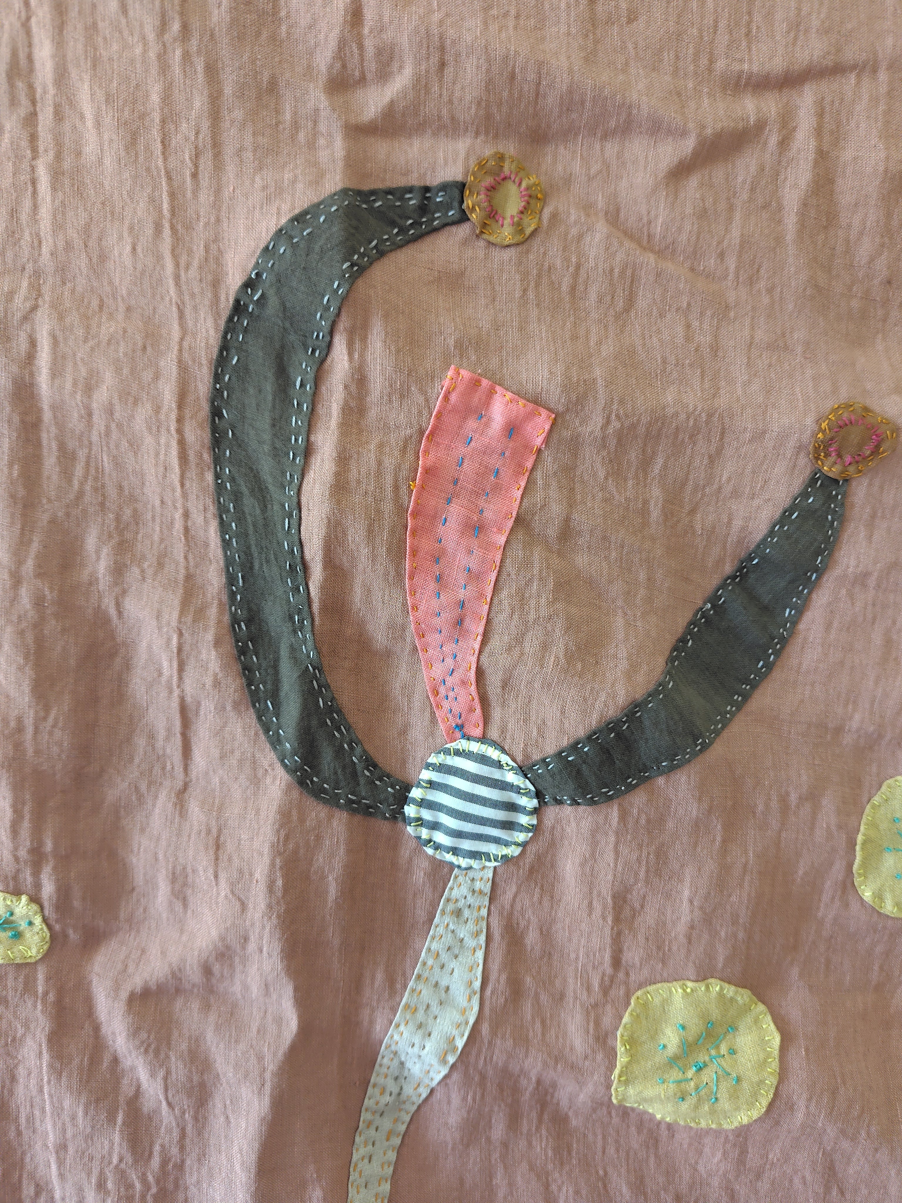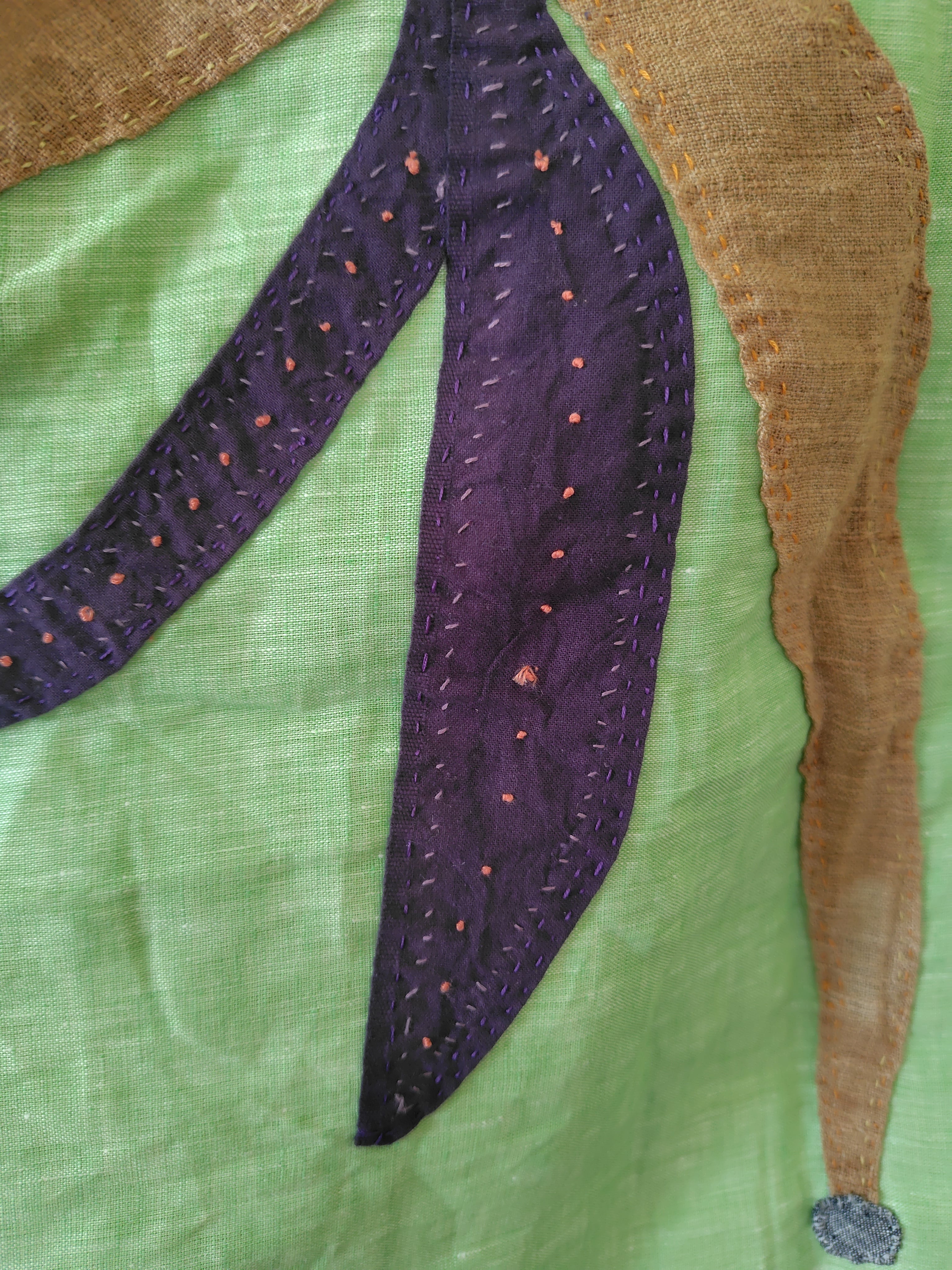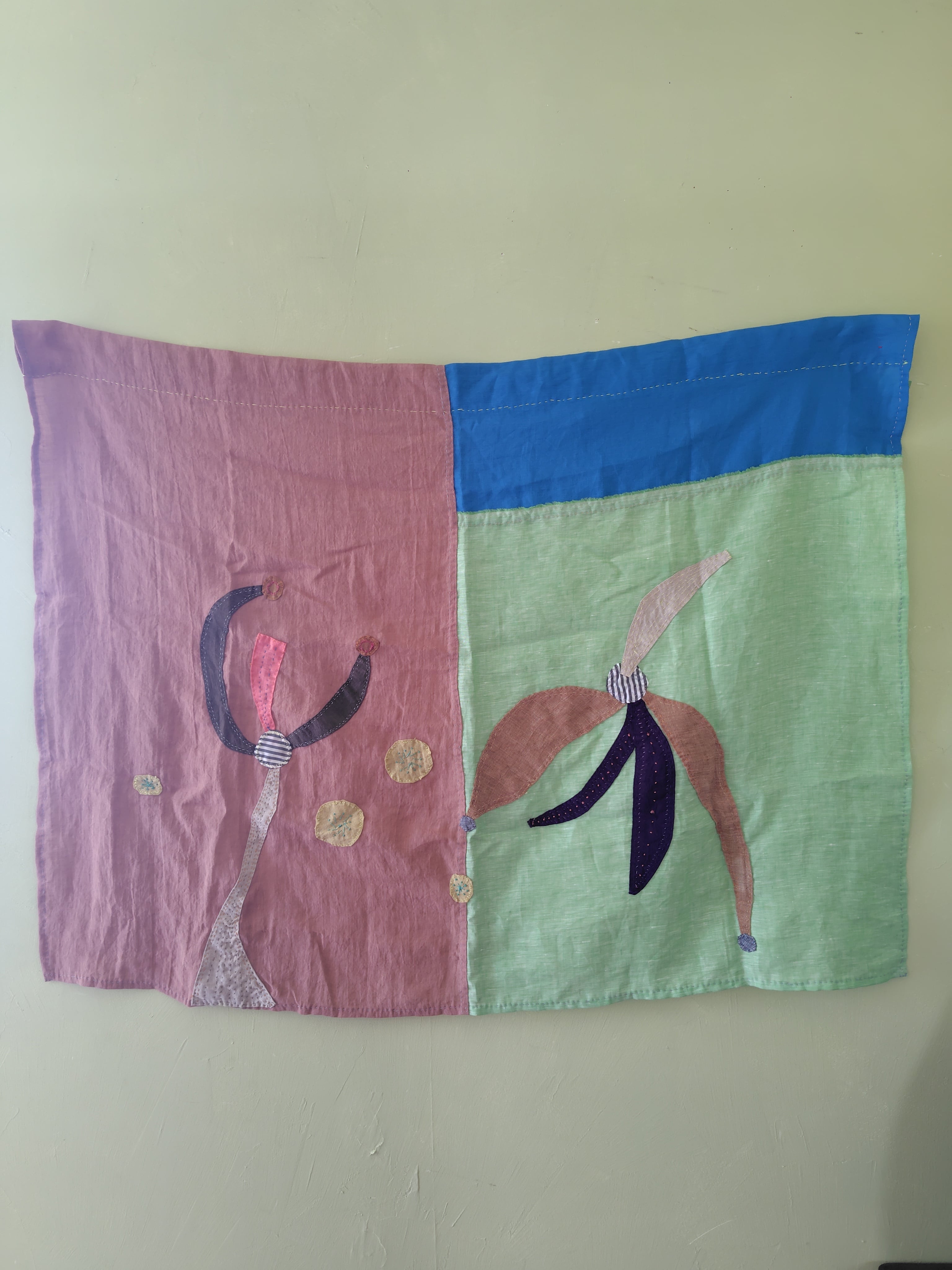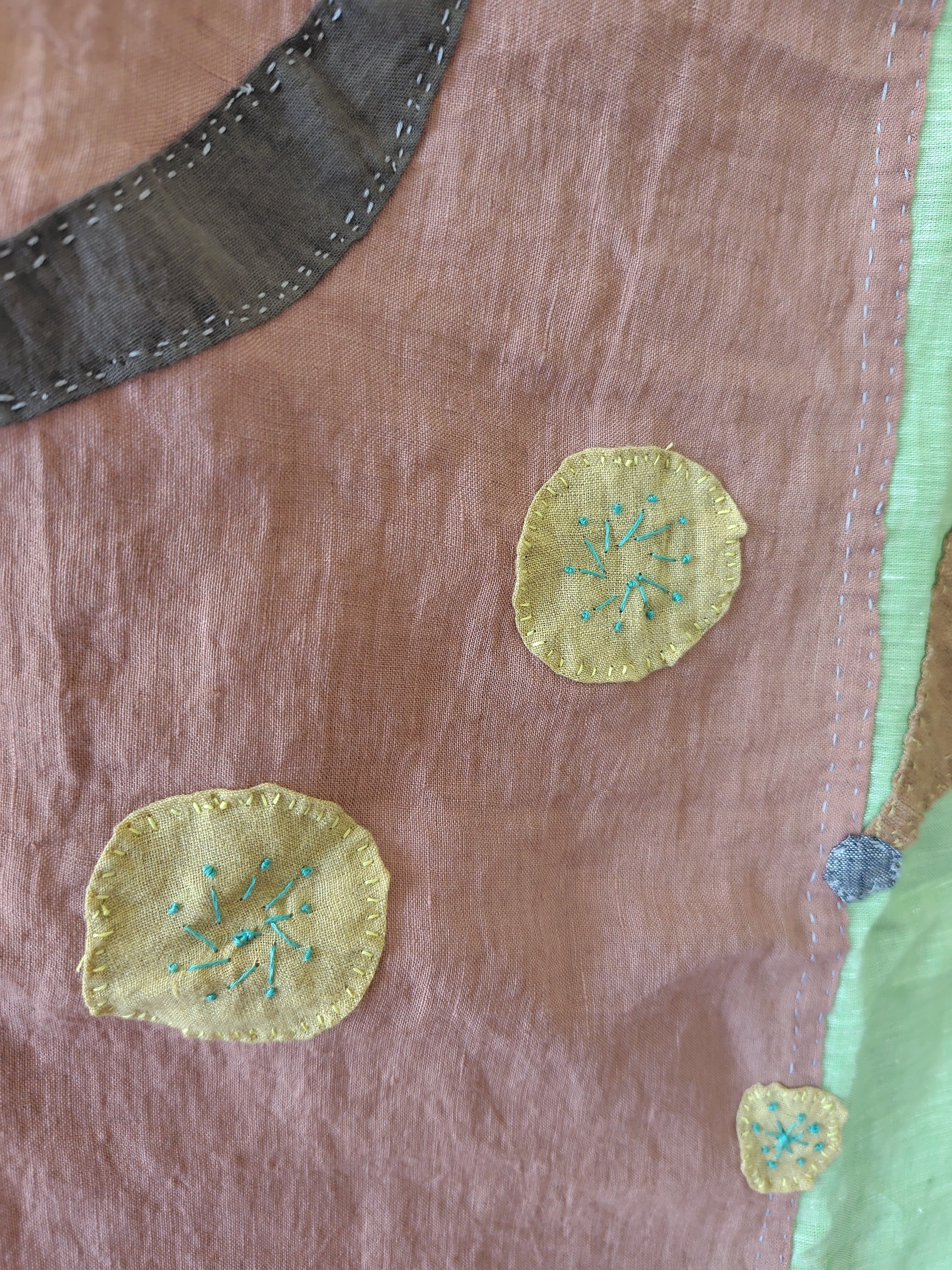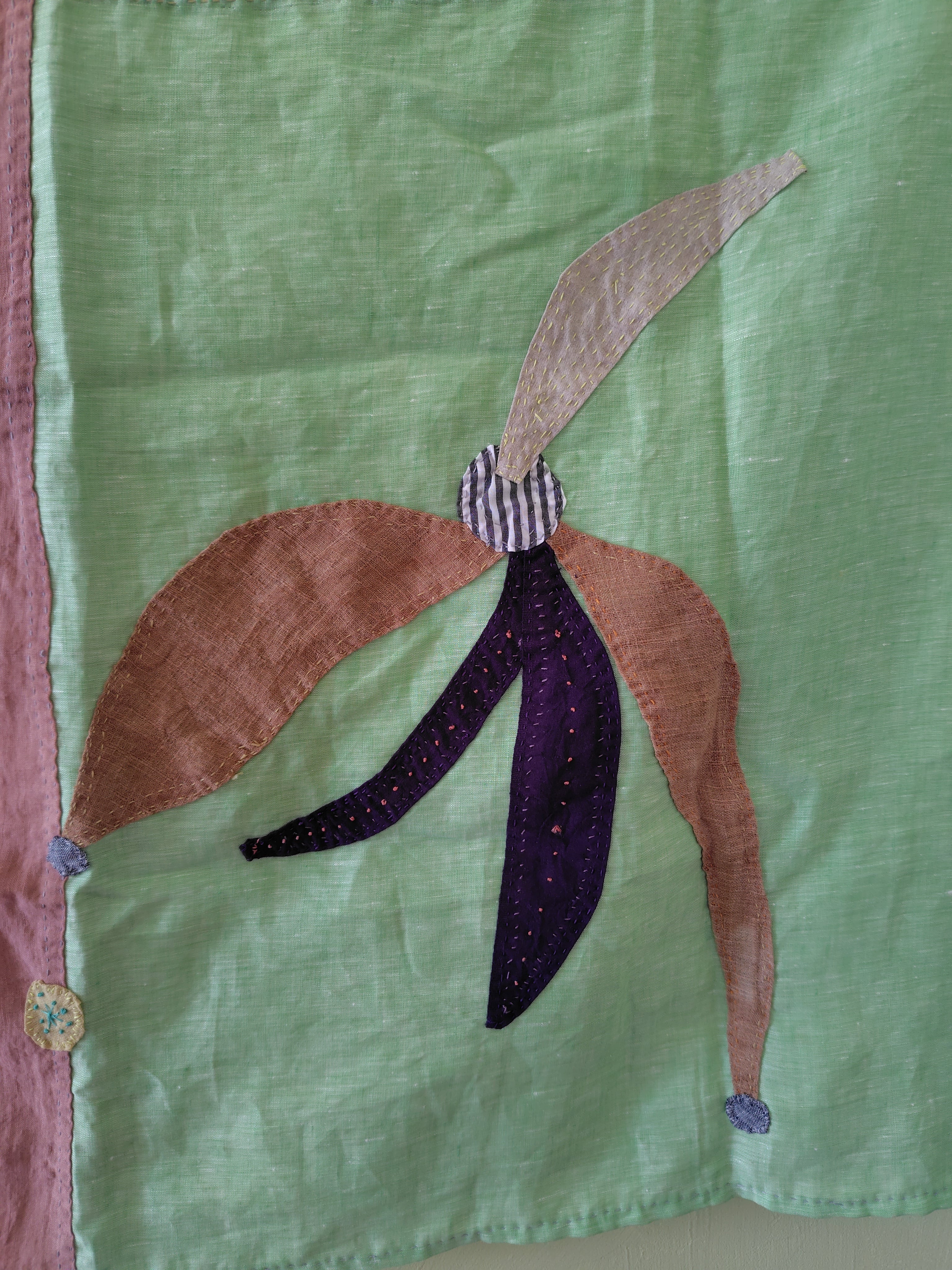 青と黄緑、ピンクのリネンを合わせました。その上から植物イメージのコラージュをしています。
