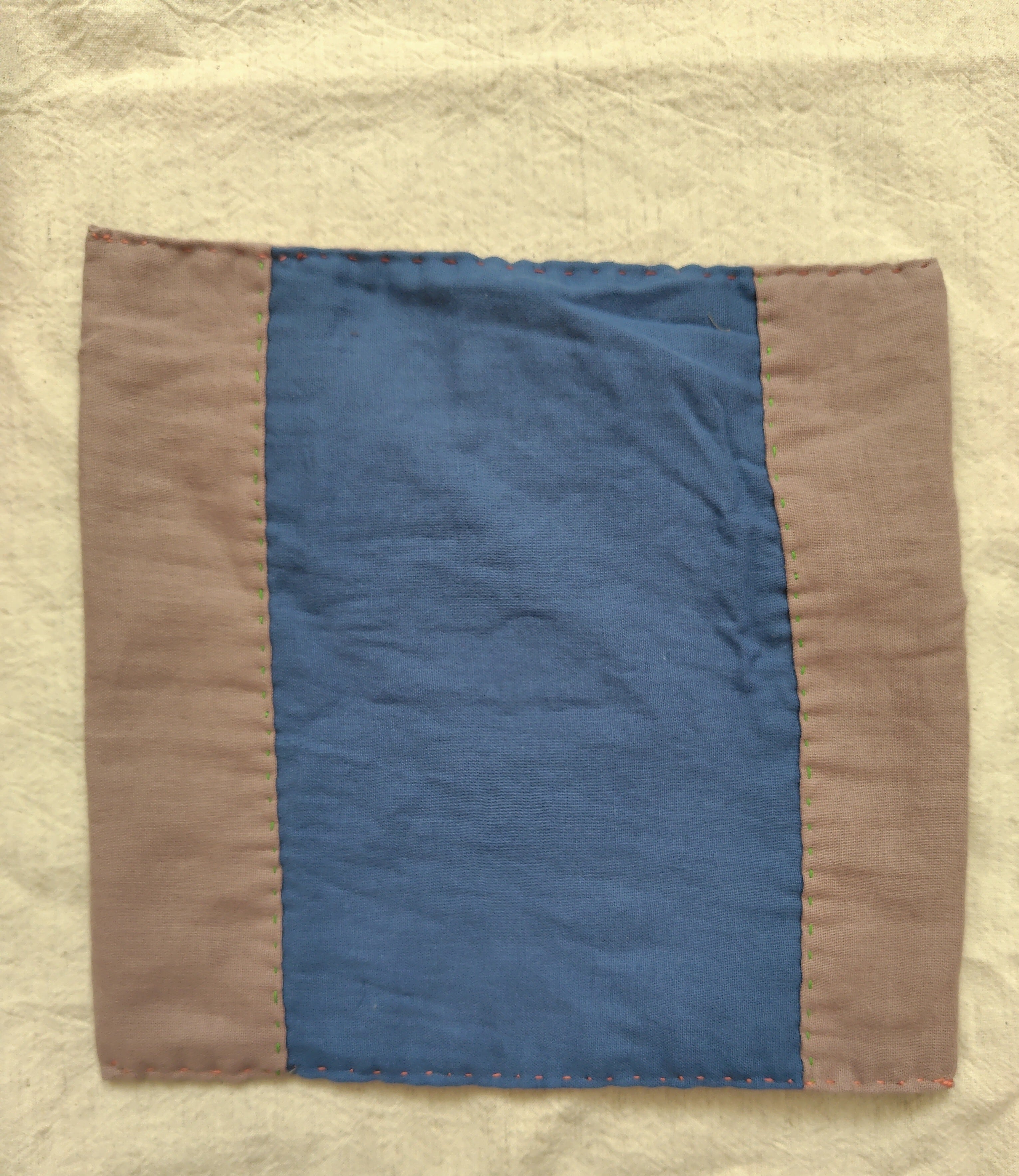 スモーキーピンクと青色の2色のダブルガーゼを使用。ポイントに植物模様のインド綿の半円を縫い付けました。