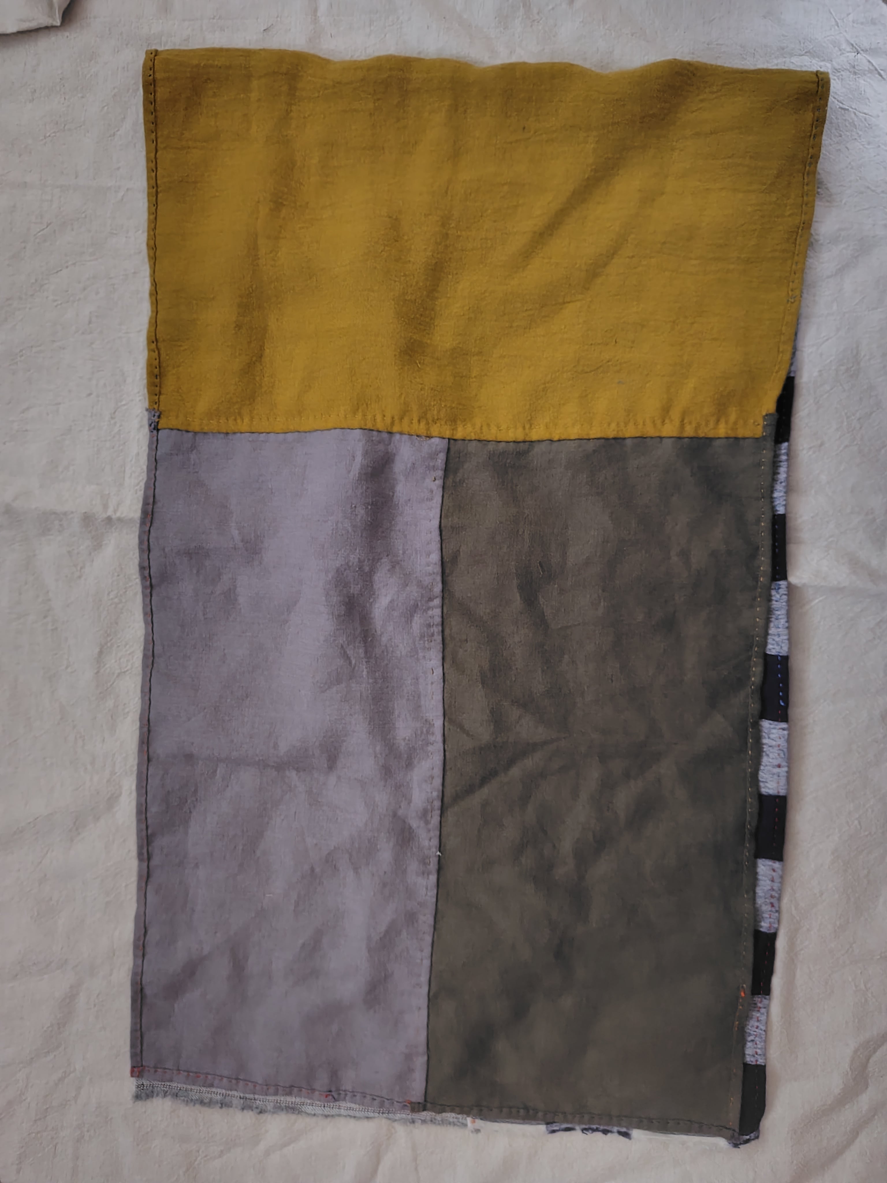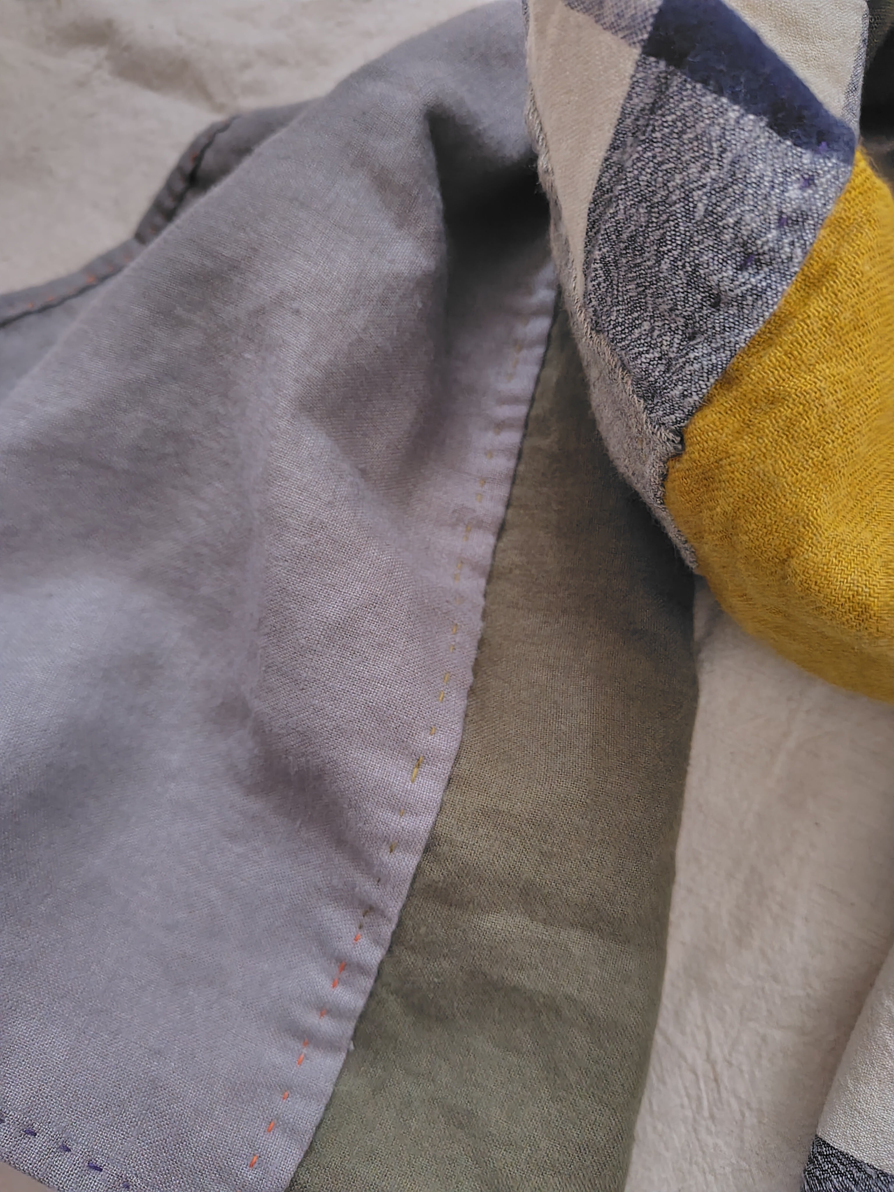 起毛のリネン(グレーとカーキ色)と、綿麻ウール(チェック)、リネンウール(マスタード色)を使用しました。とても柔らかくて肌触りのいいストールです。