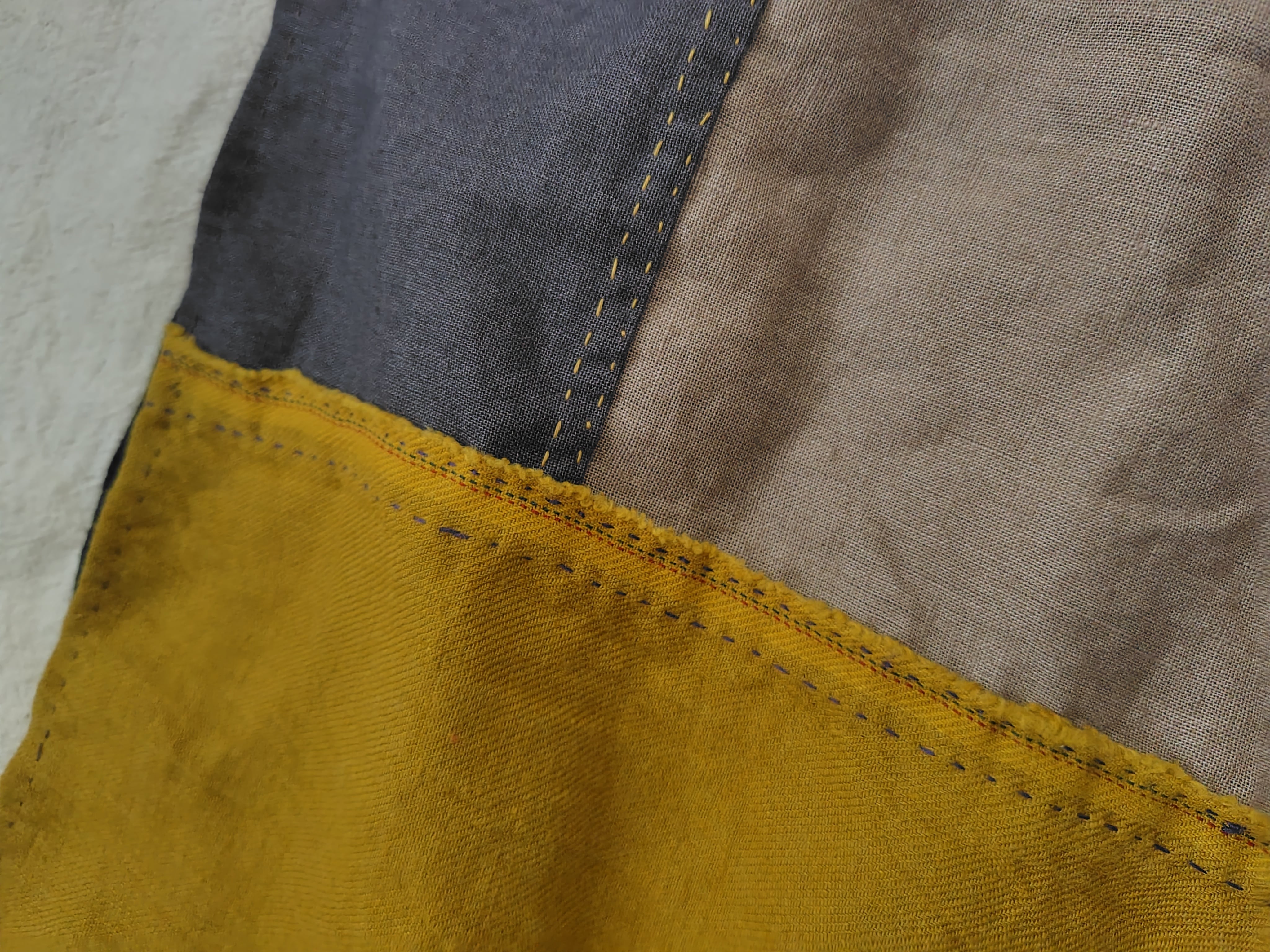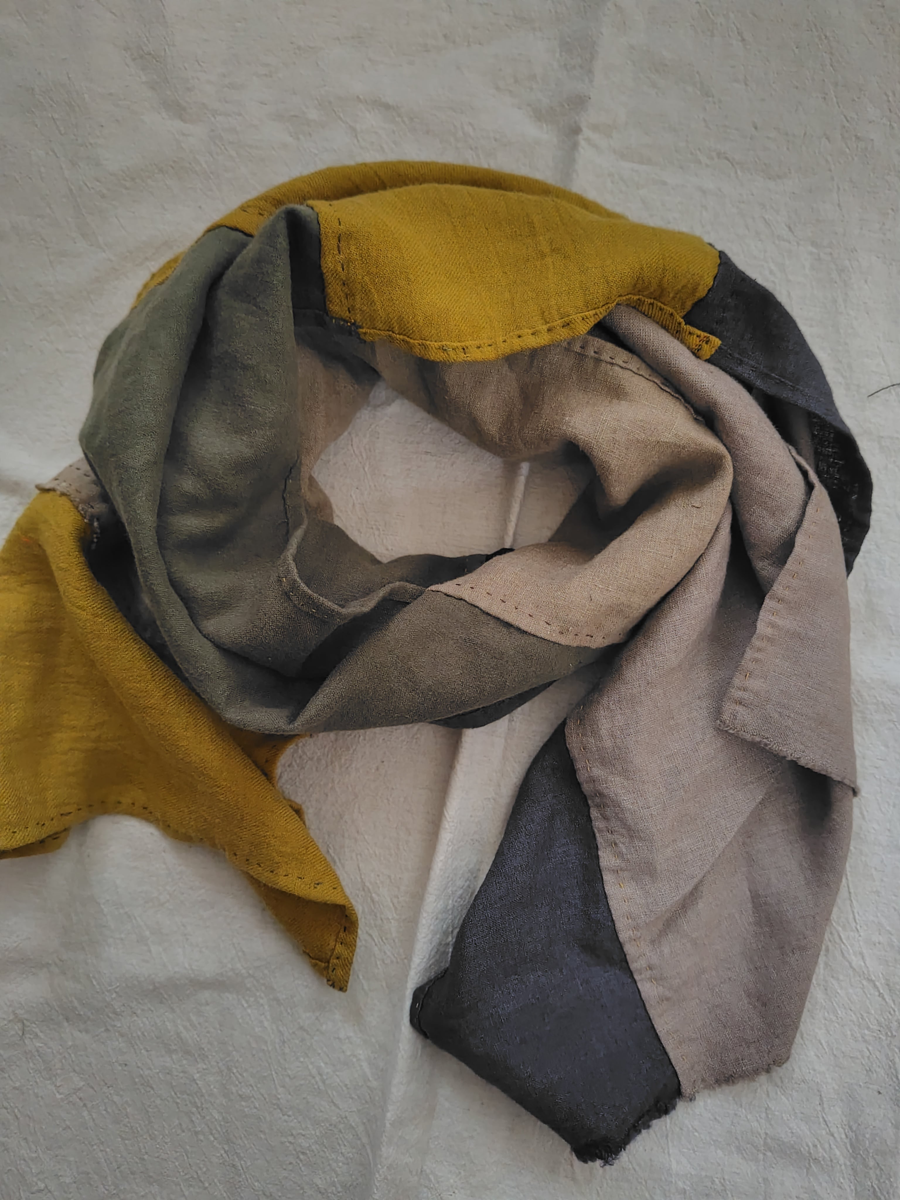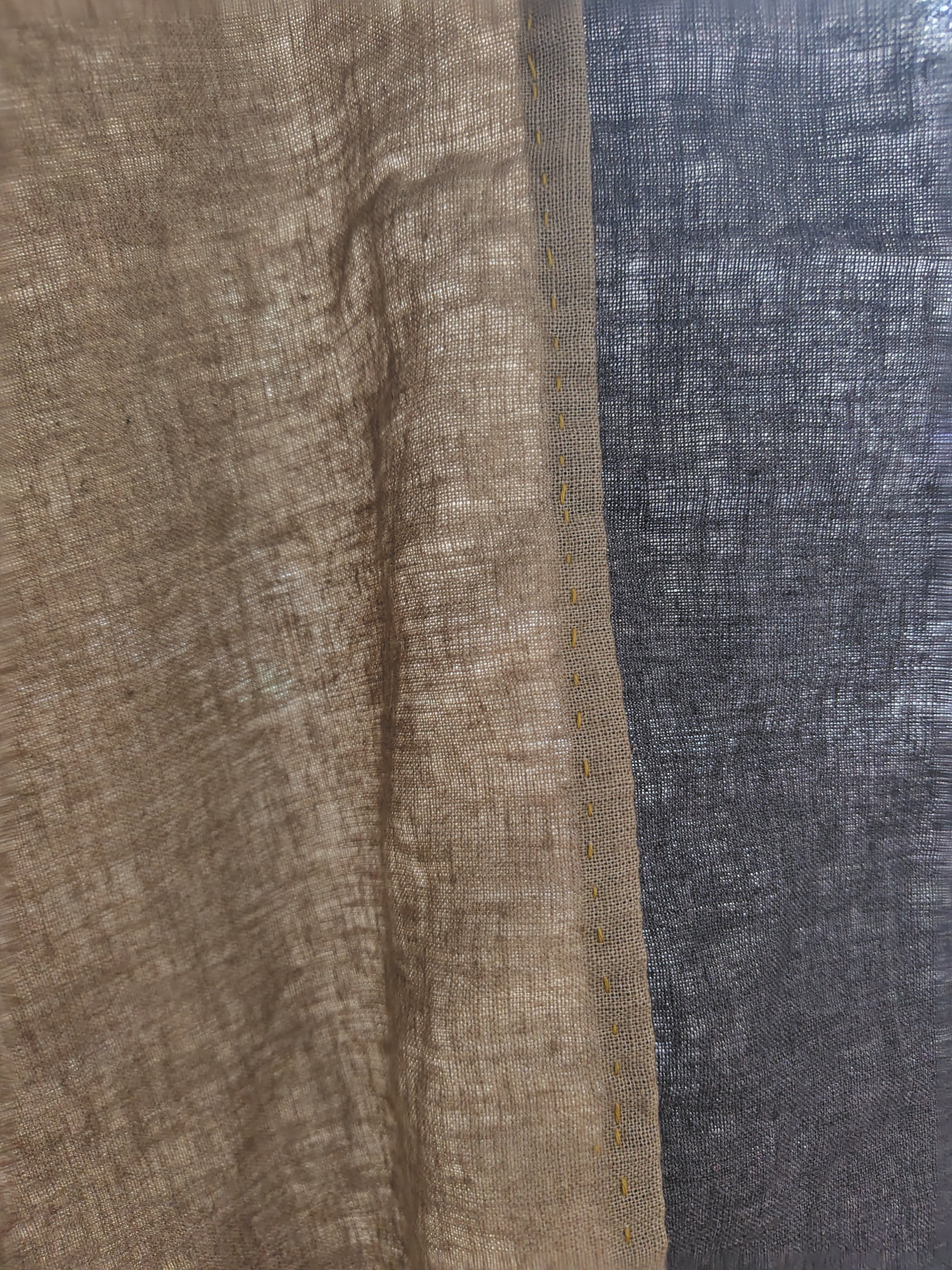 起毛のリネン(ベージュ、カーキ、グレー)、リネンウール(黒、マスタード色)を使用しました。とても柔らかくて肌触りのいいストールです。