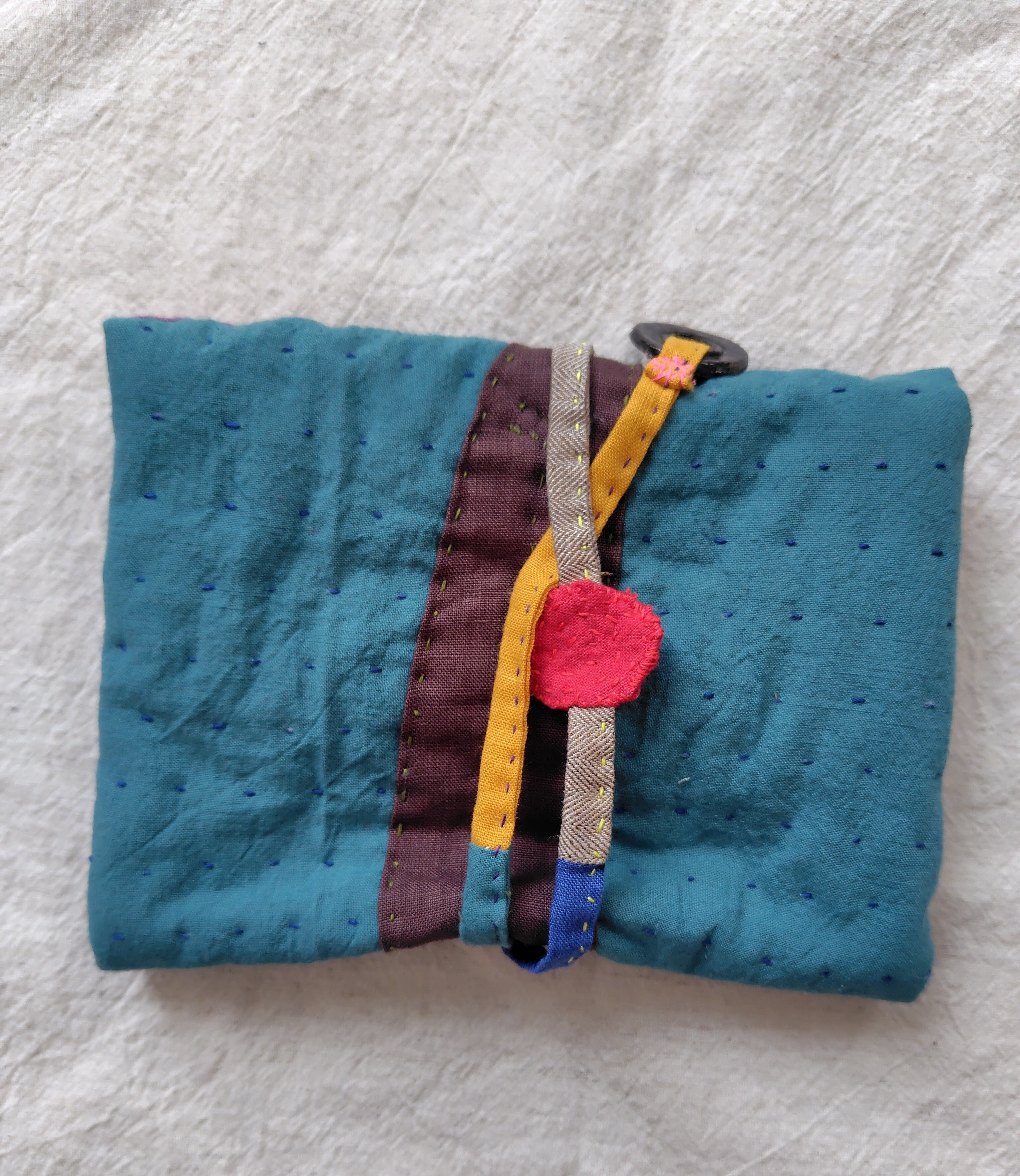 真ん中にスナップボタンをつけましたので、中身がばらりと落ちるのを防ぎます。