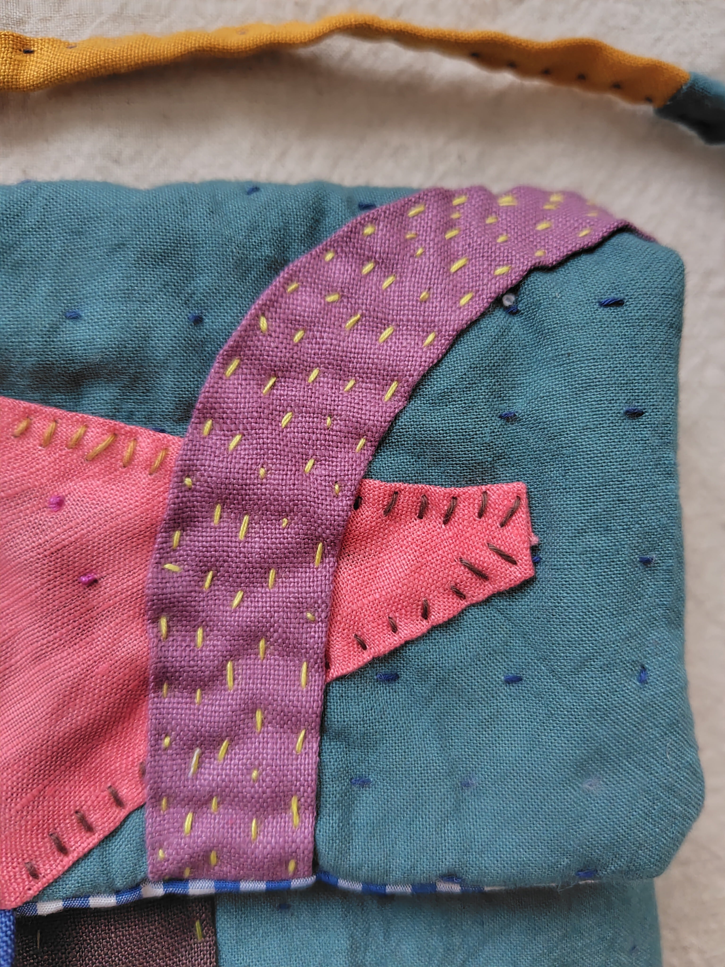 少しくすんだ青のリネンに全体に紺色の糸でちくちくと縫い、その上からコラージュをしました。