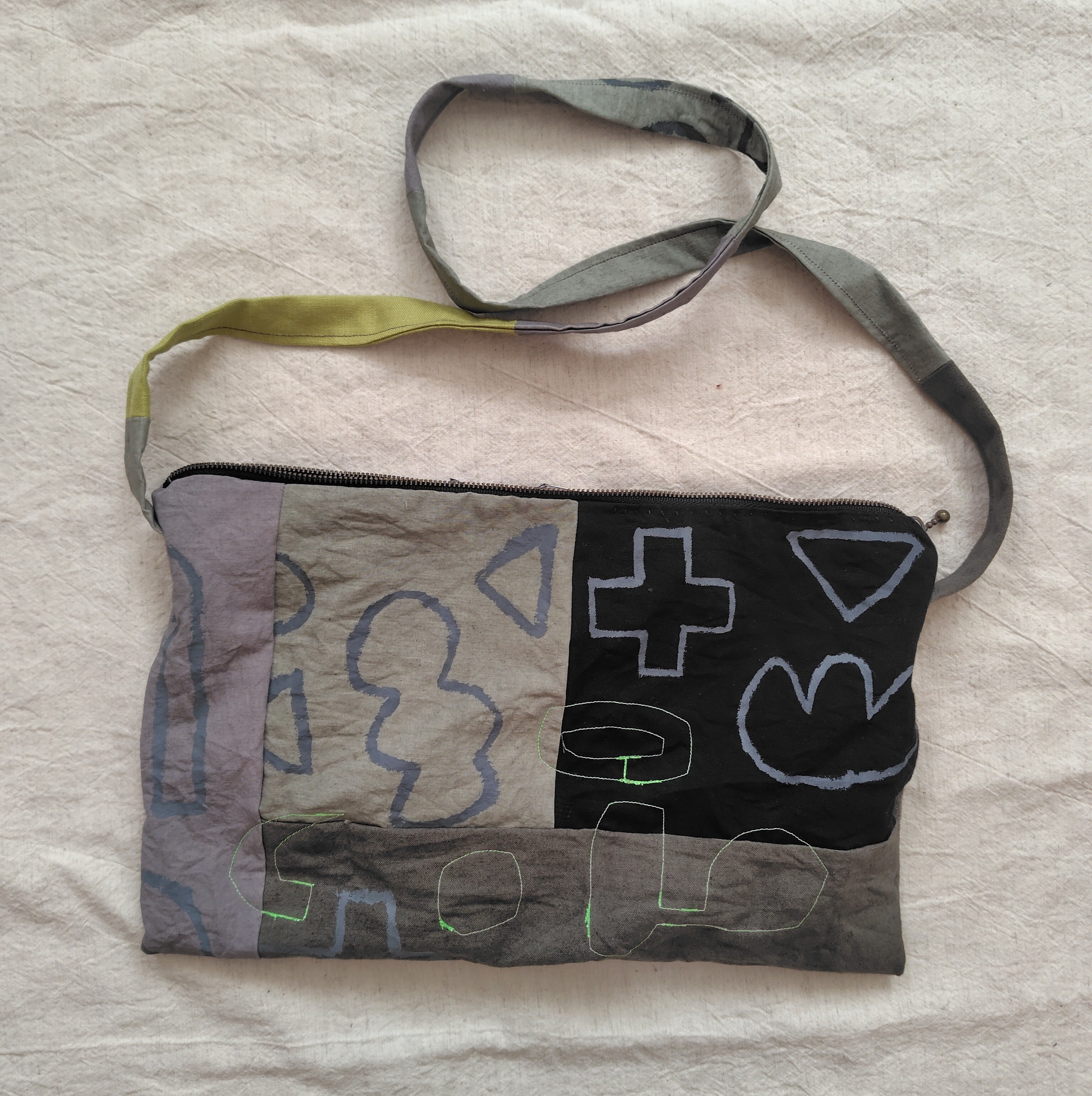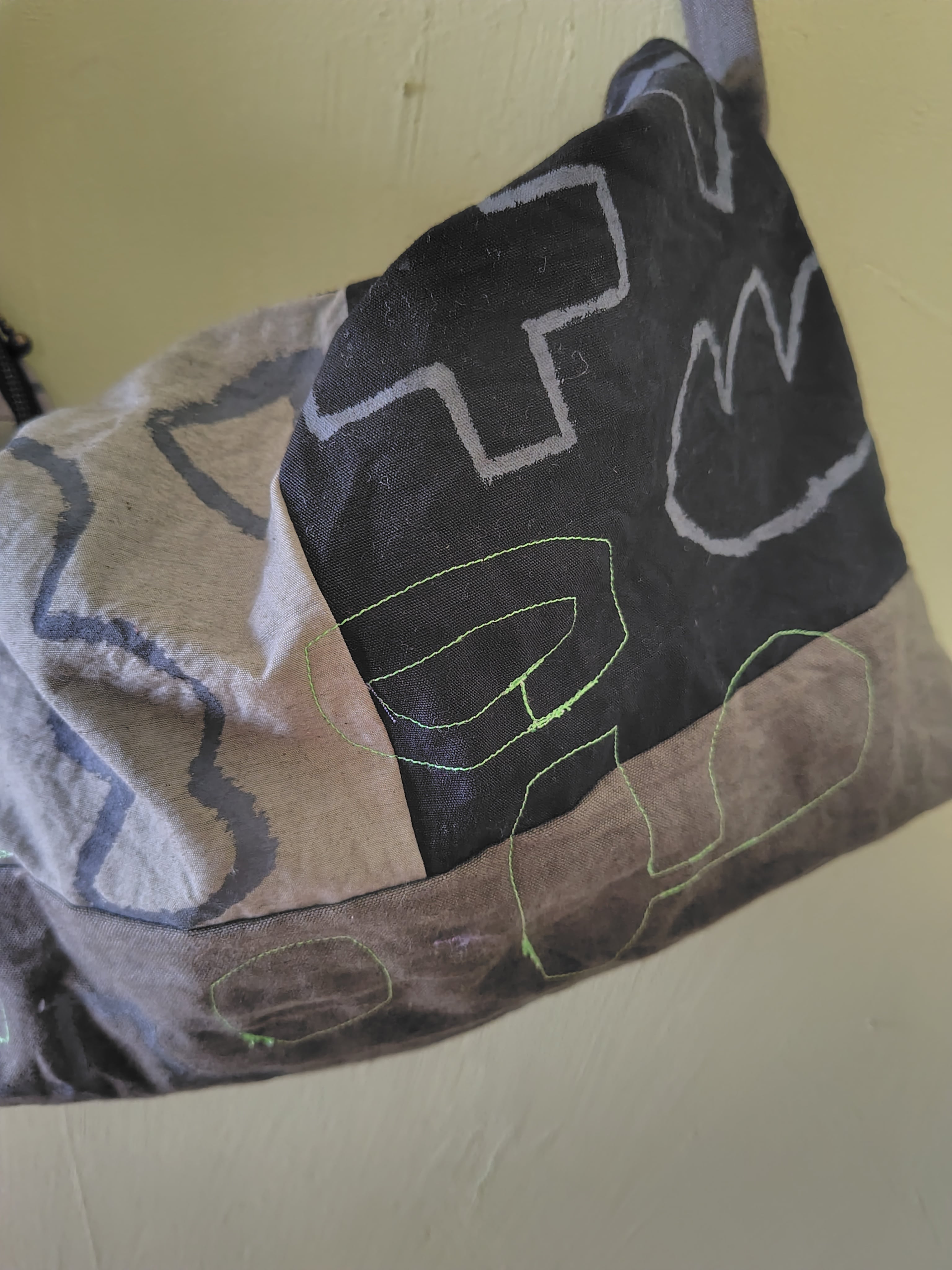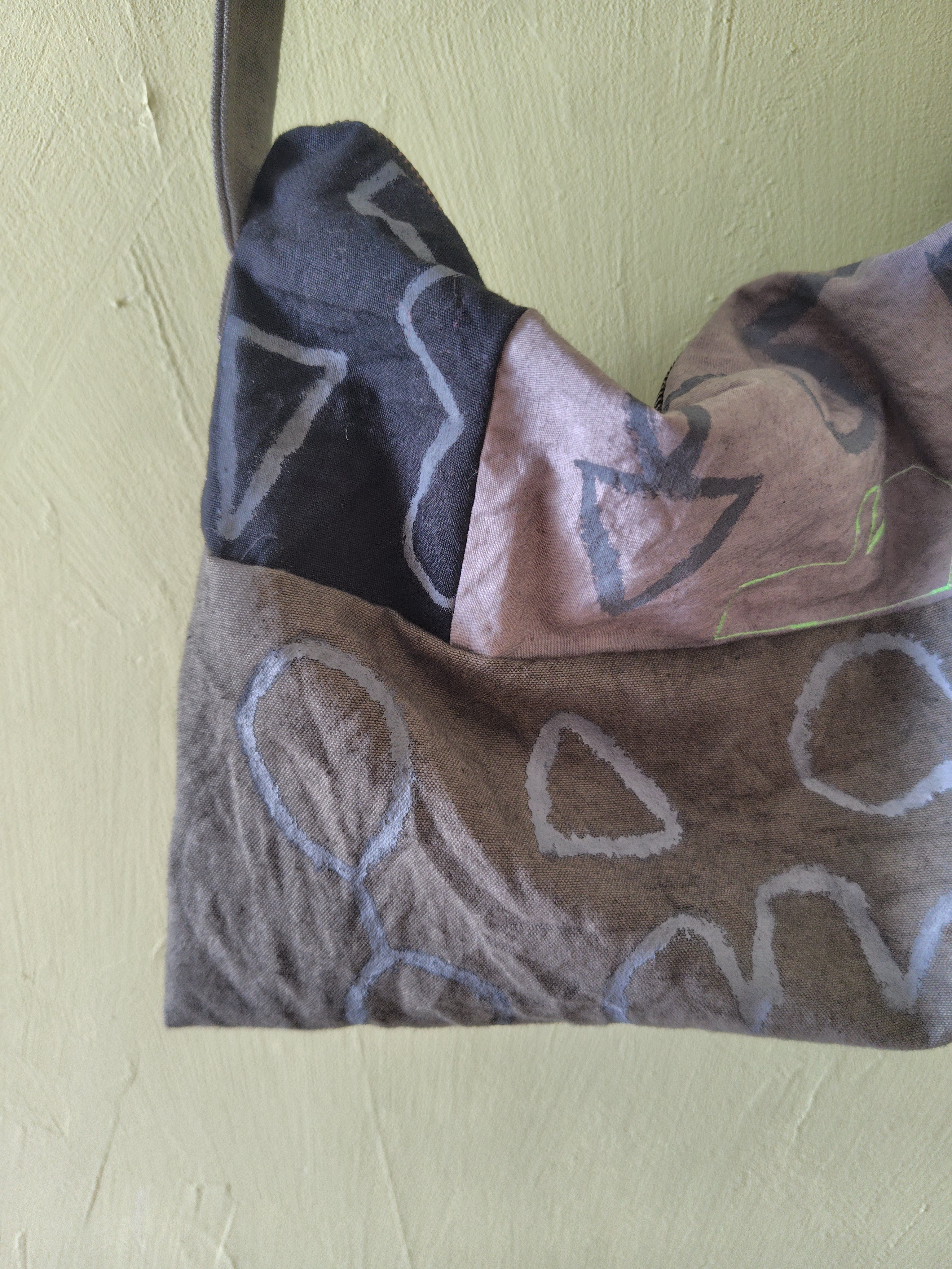 ハリのあるコットン(黒、グレー、カーキ色)の布にグレー色で手描きの柄を描きました。