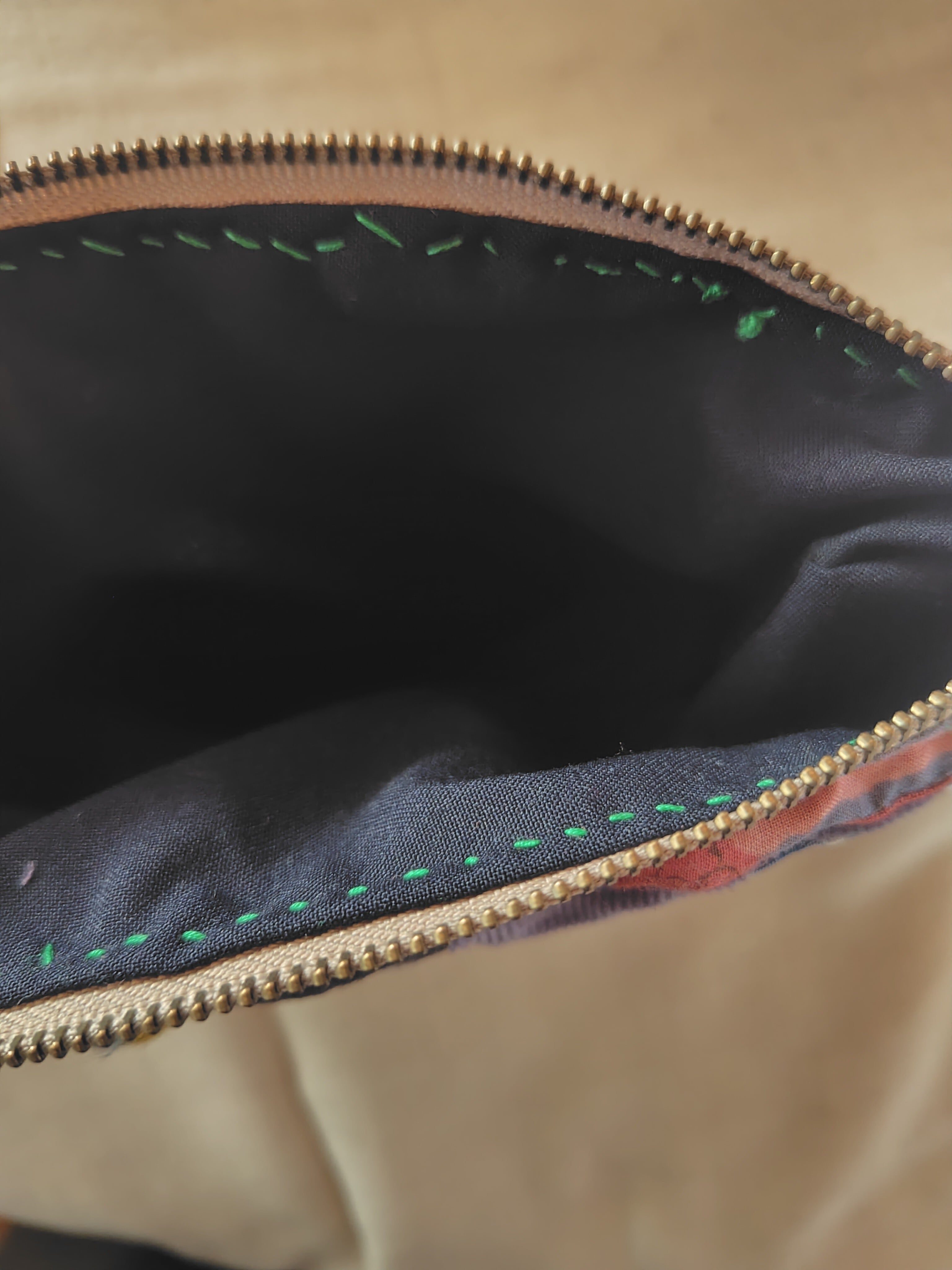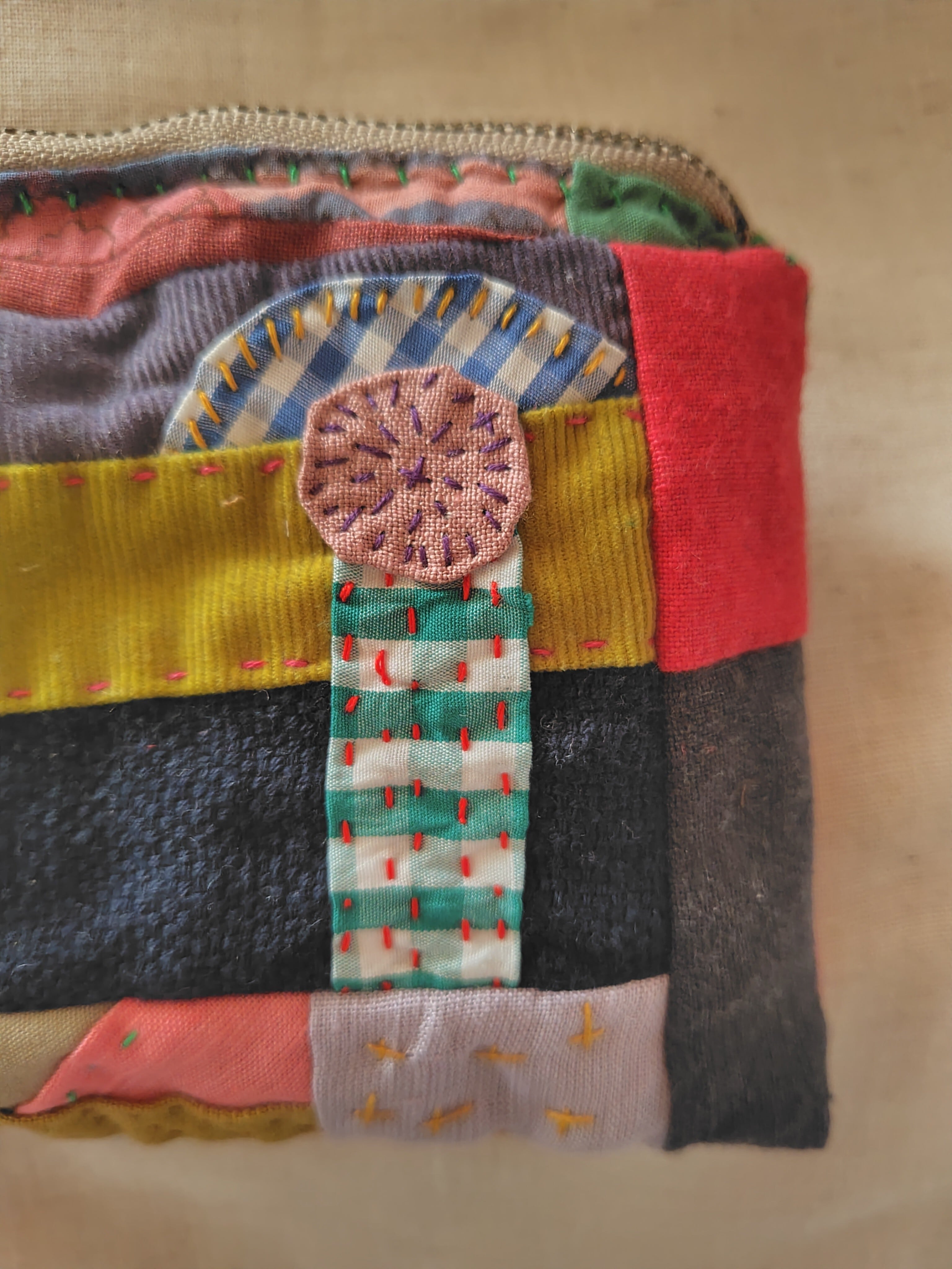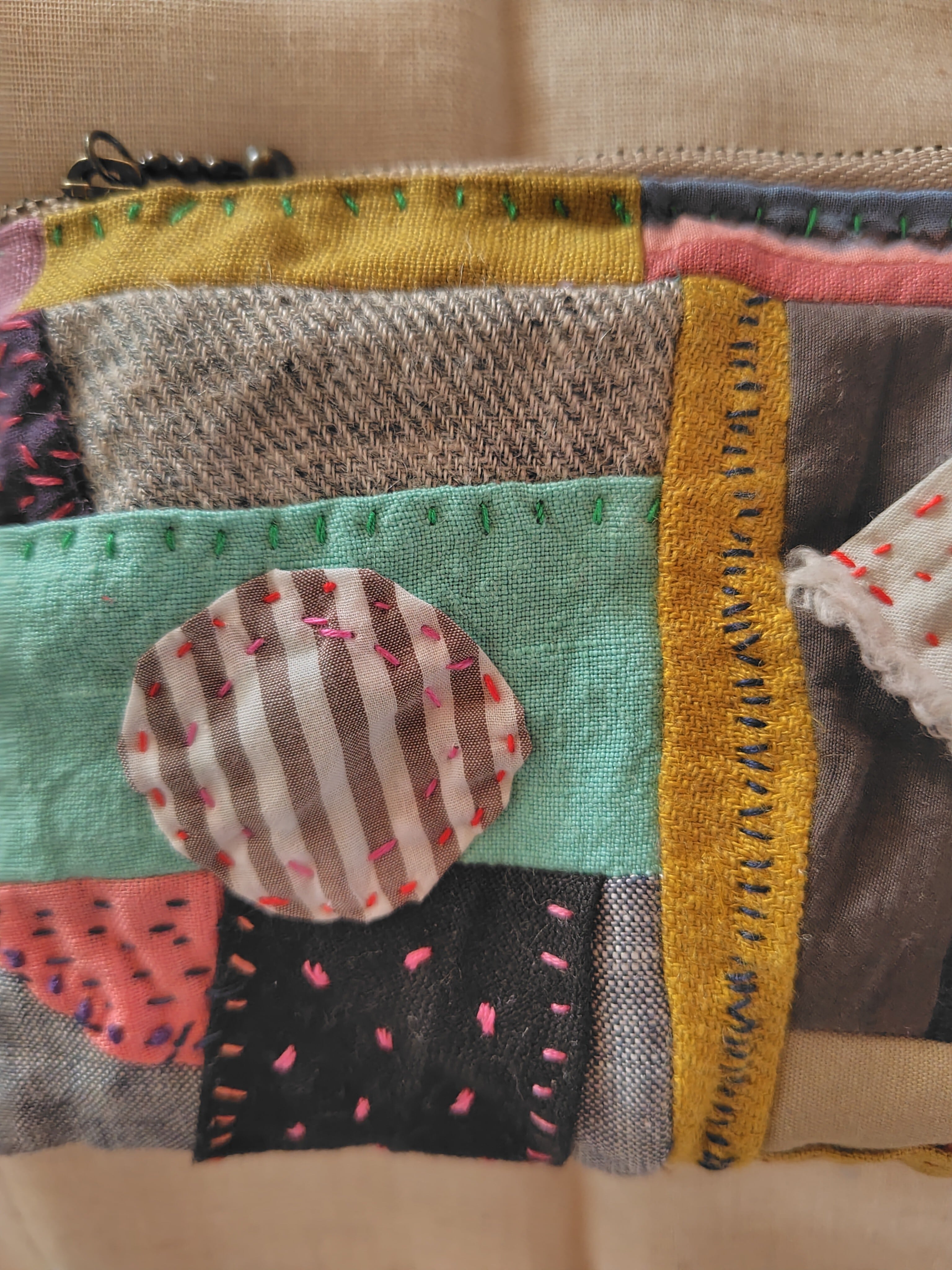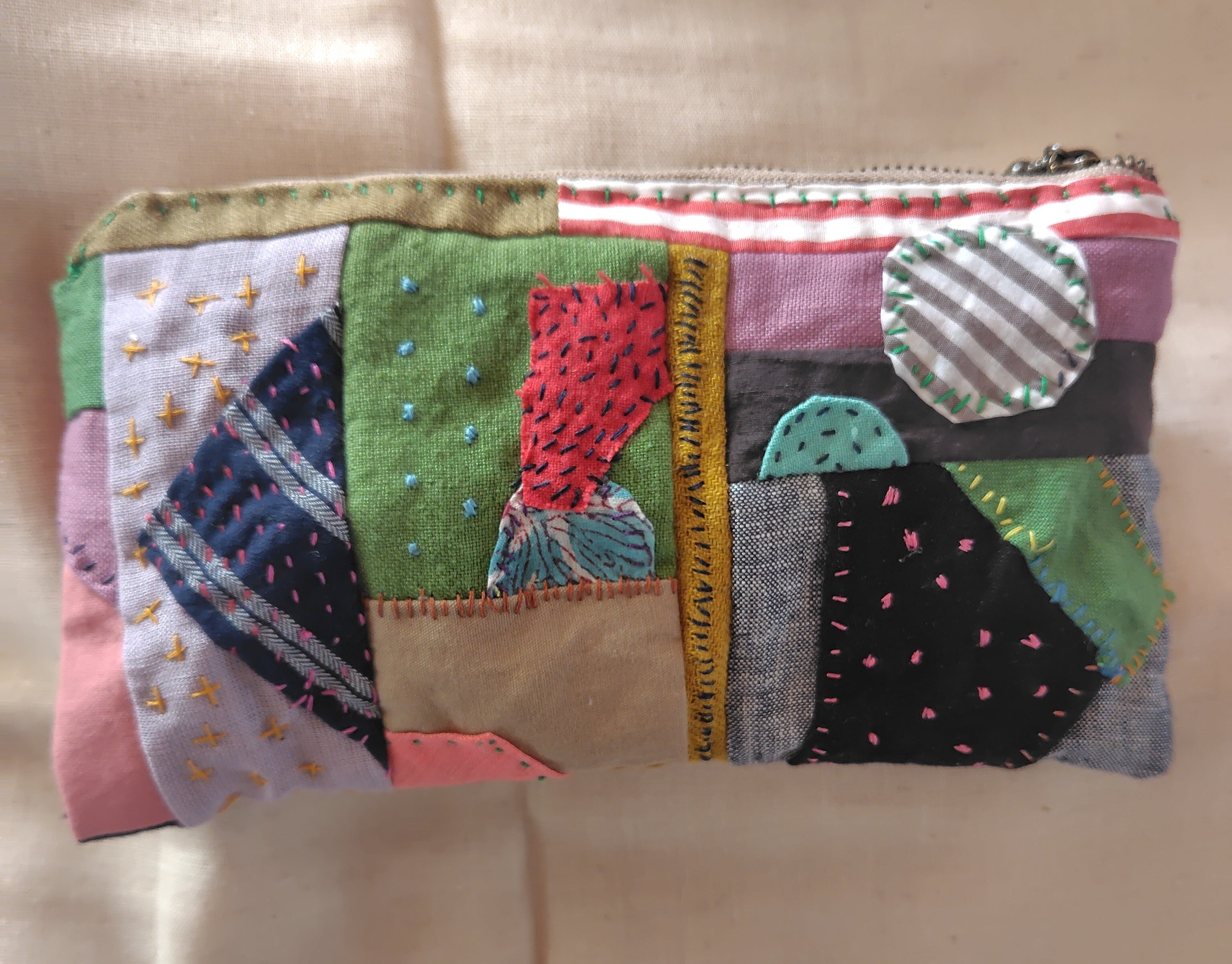 小さなパーツにコラージュした生地をつなぎ合わせてポーチにしています。