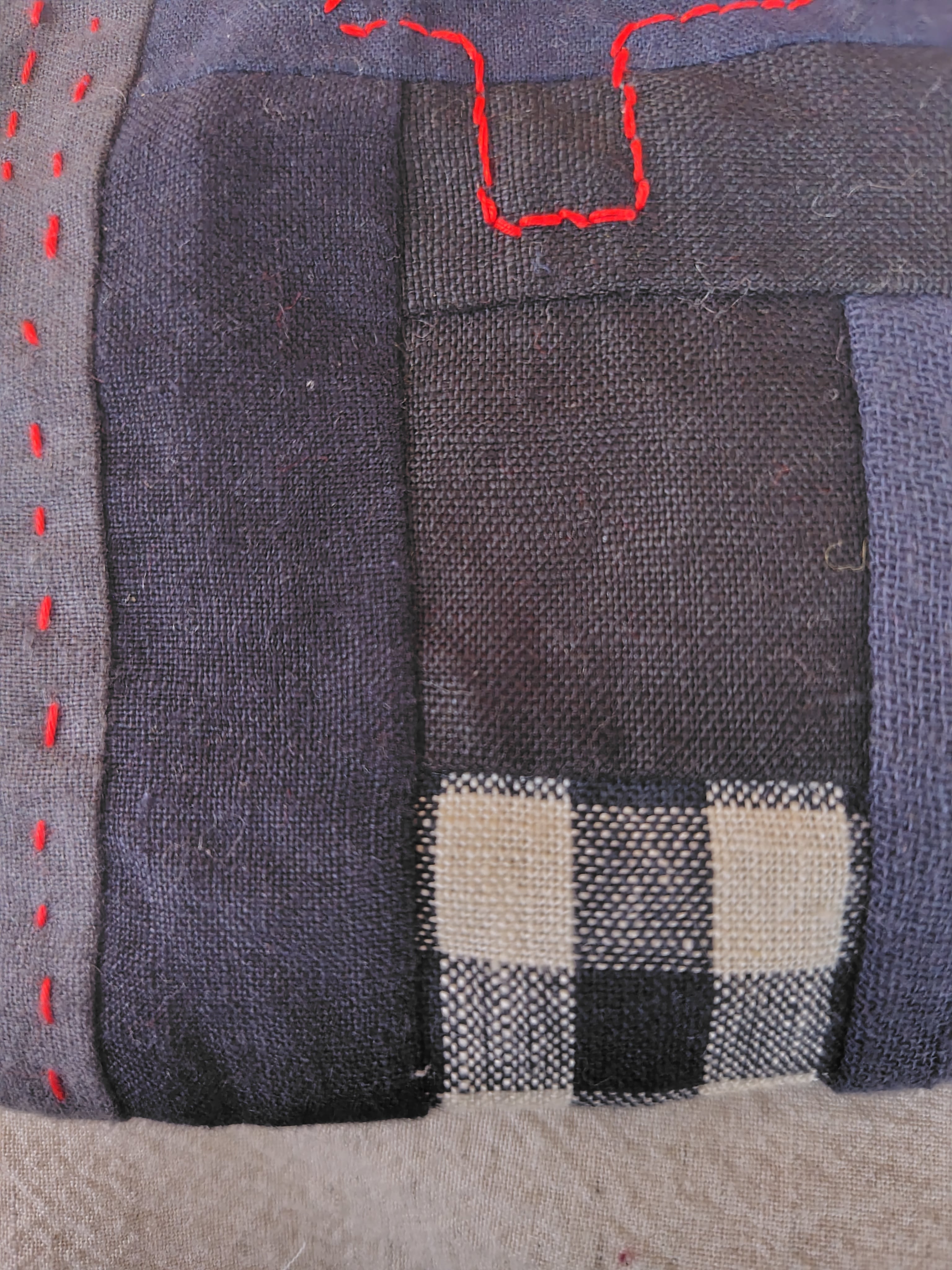 紺や黒、濃いめの灰色などをパッチワークのように合わせ、ポイントに上から赤の糸で十字柄などを手縫いで入れました。
