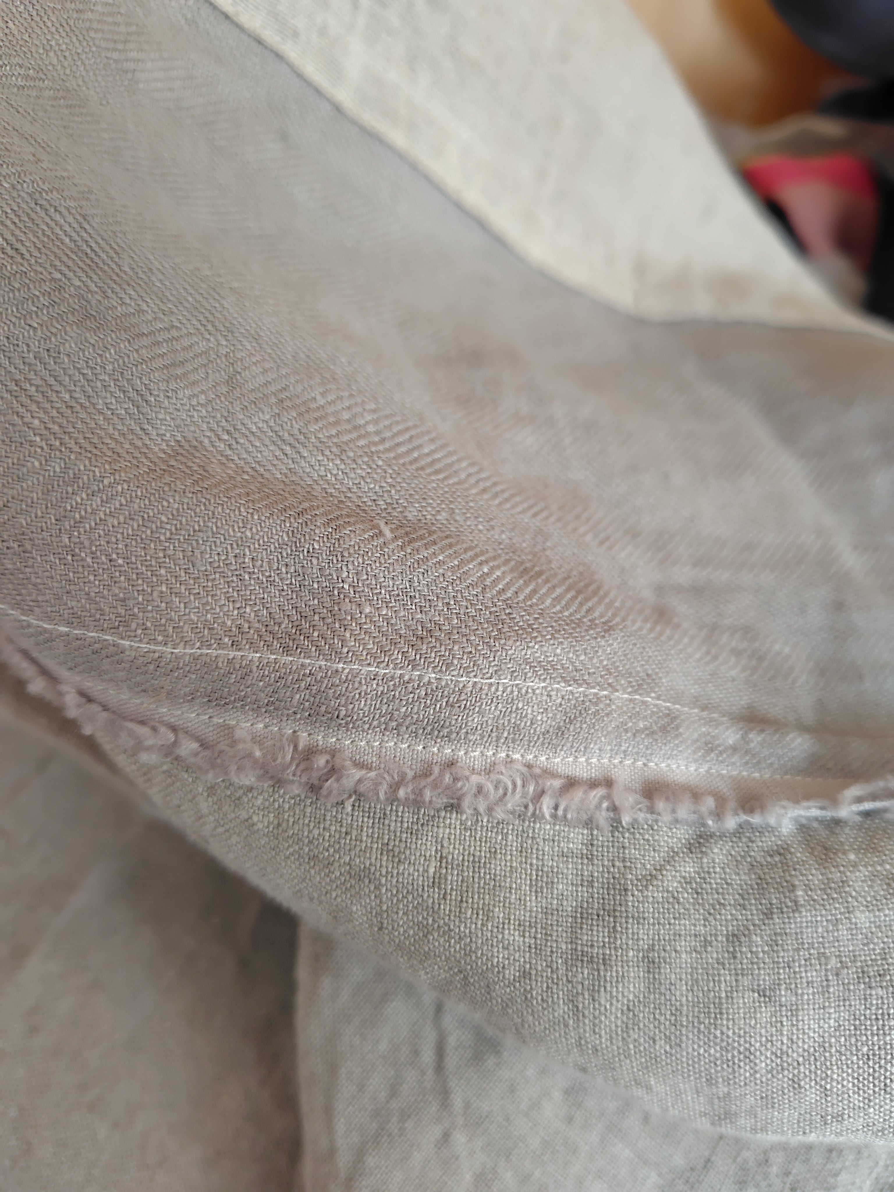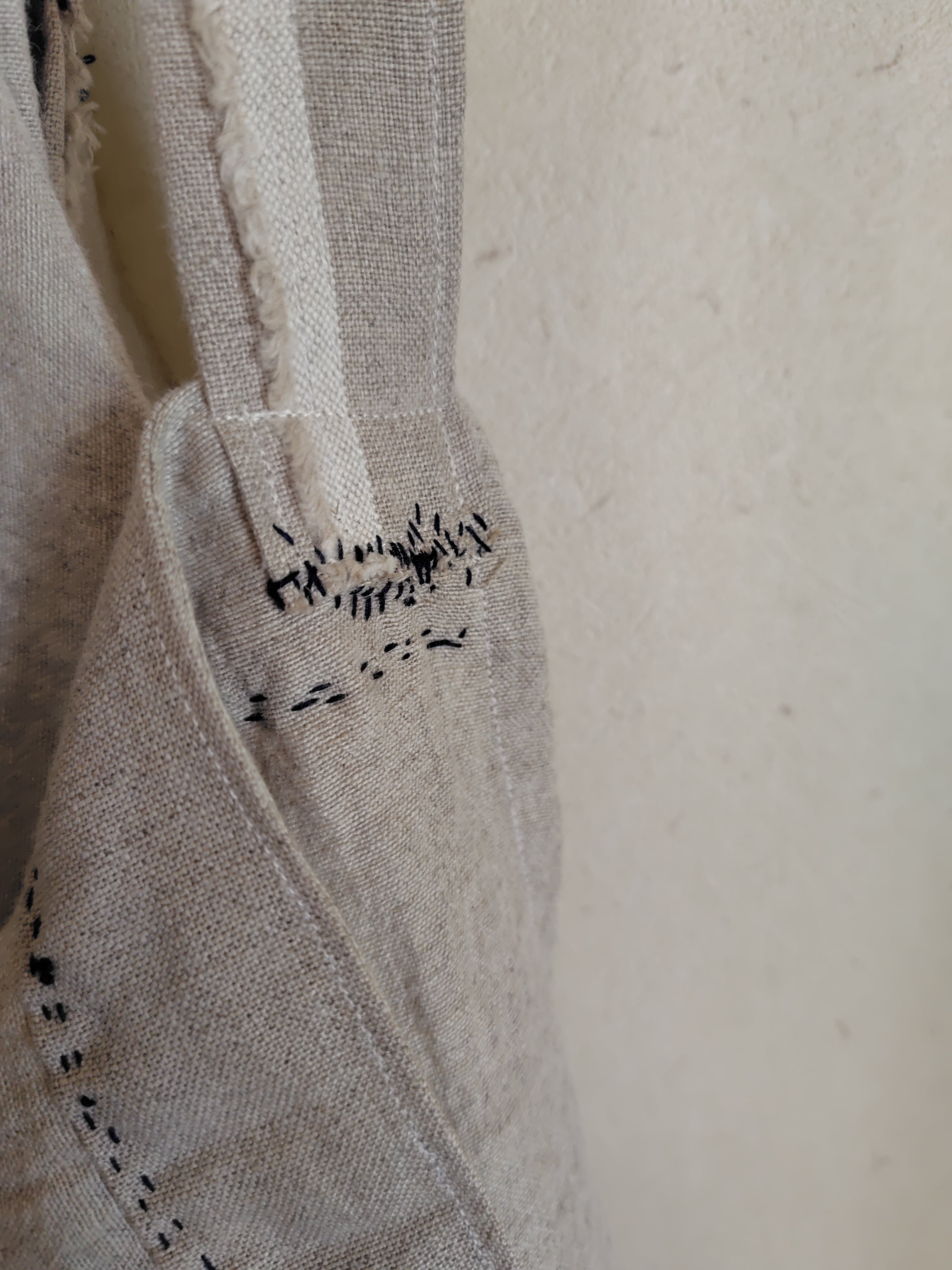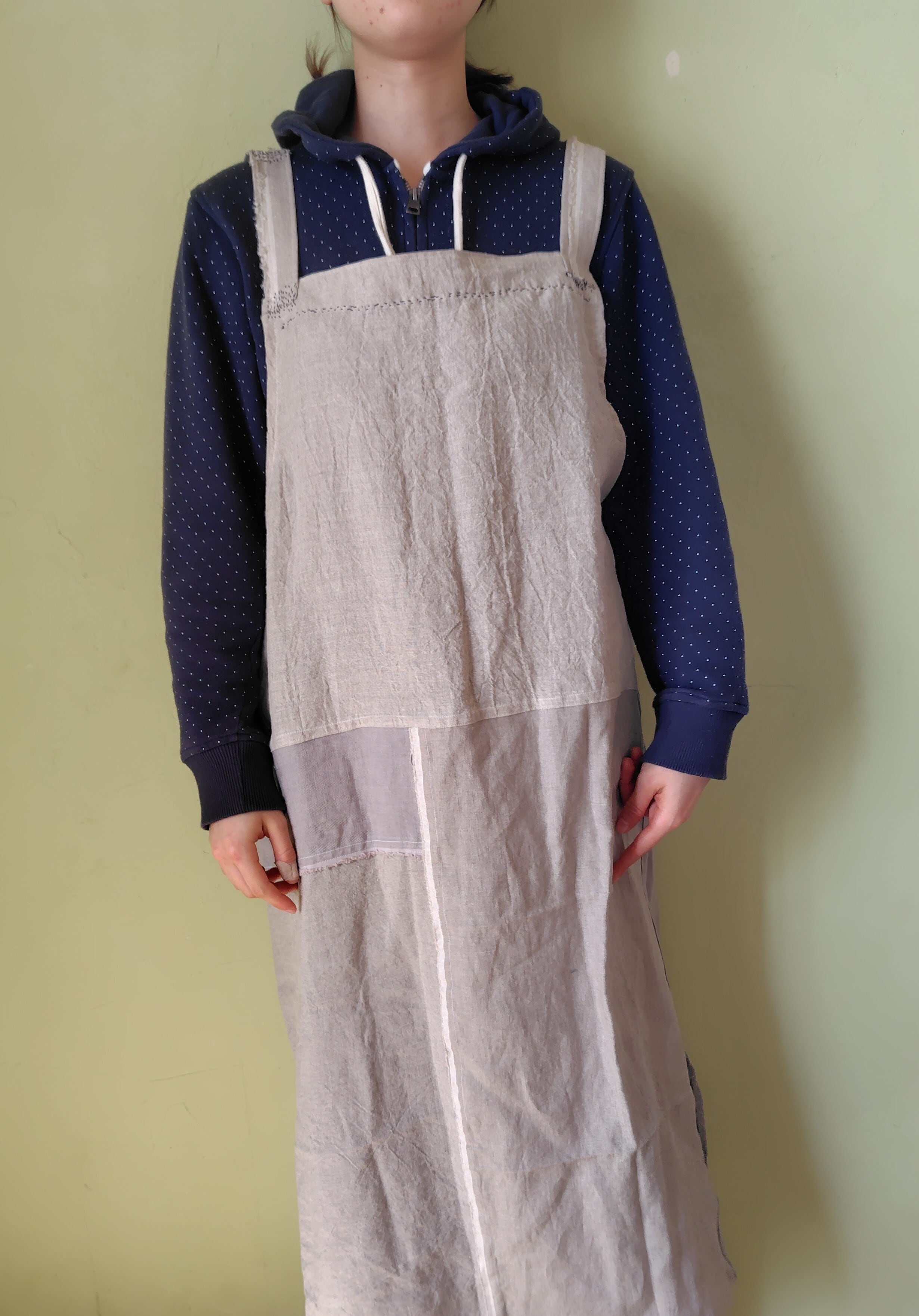 白系のリネンをパッチワークのように合わせました。肩紐部分のつなぎ目や、胸当て部分には手縫いを入れています。