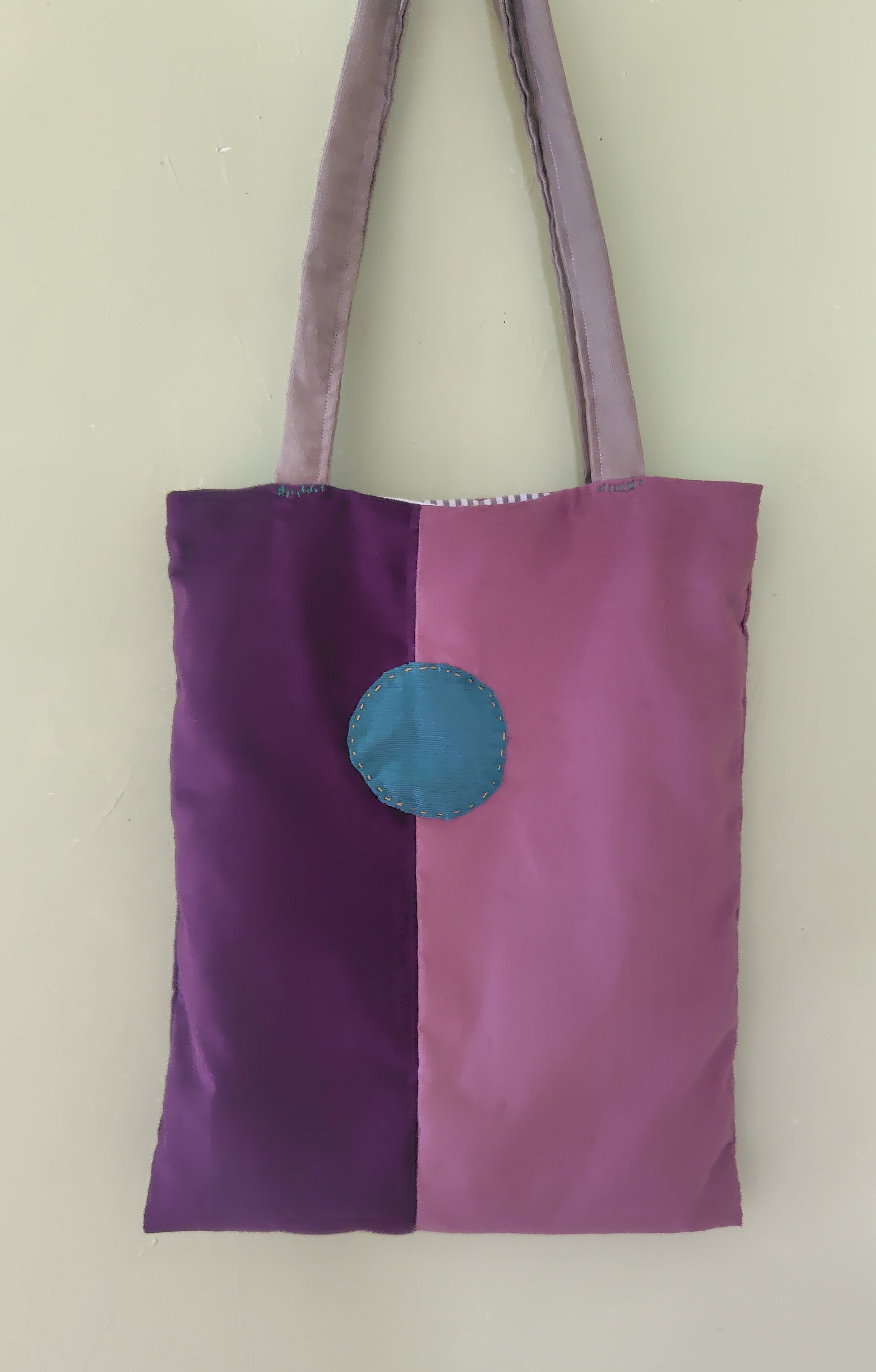 中央にはエメラルドグリーン色の丸を縫い付けています。