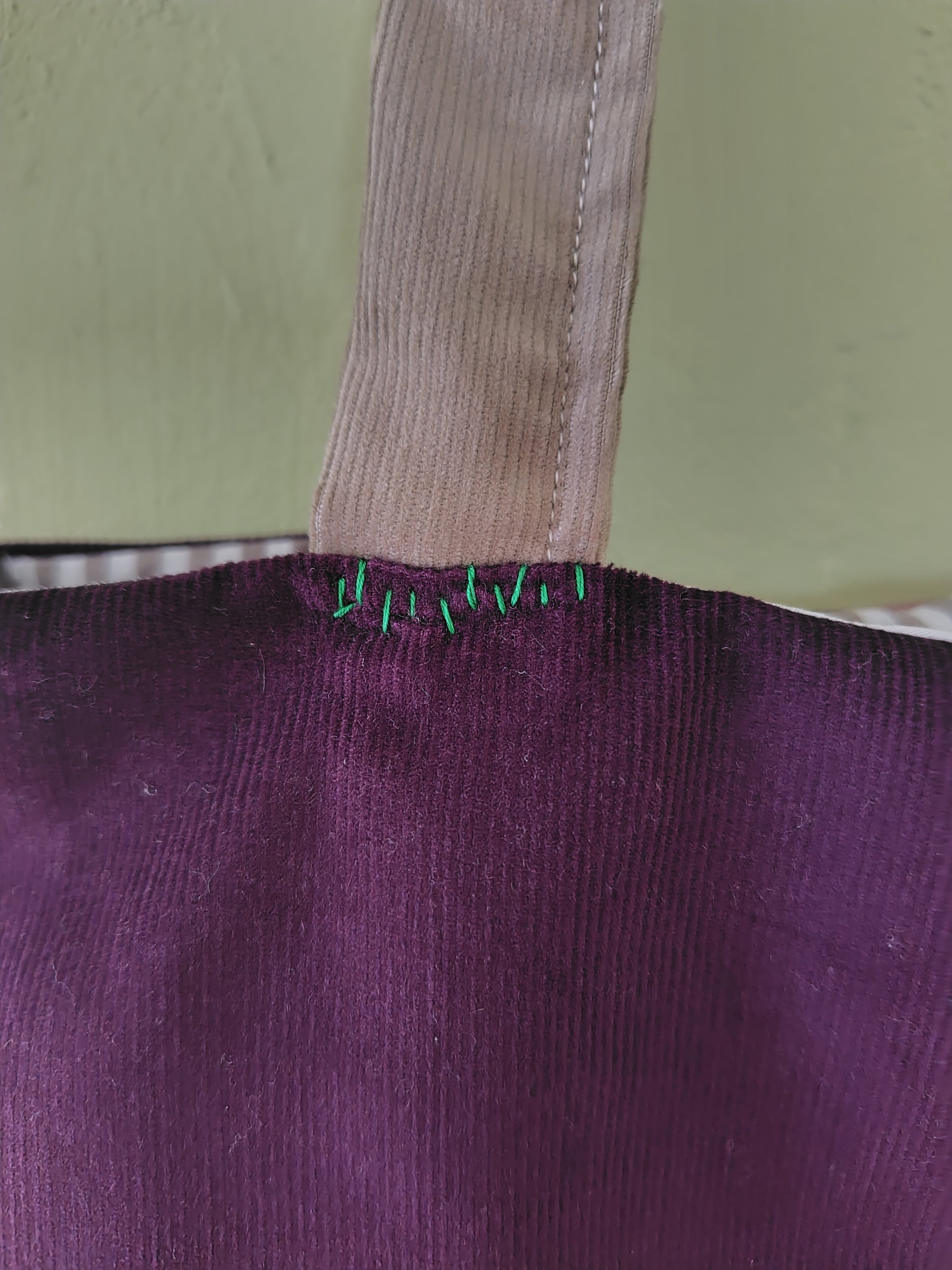 細畝コーデュロイを使用しています。濃いめのぶどう色に近い紫色と、ピンクが少し入ったような明るめの紫色の2色の紫色を使用しています。
