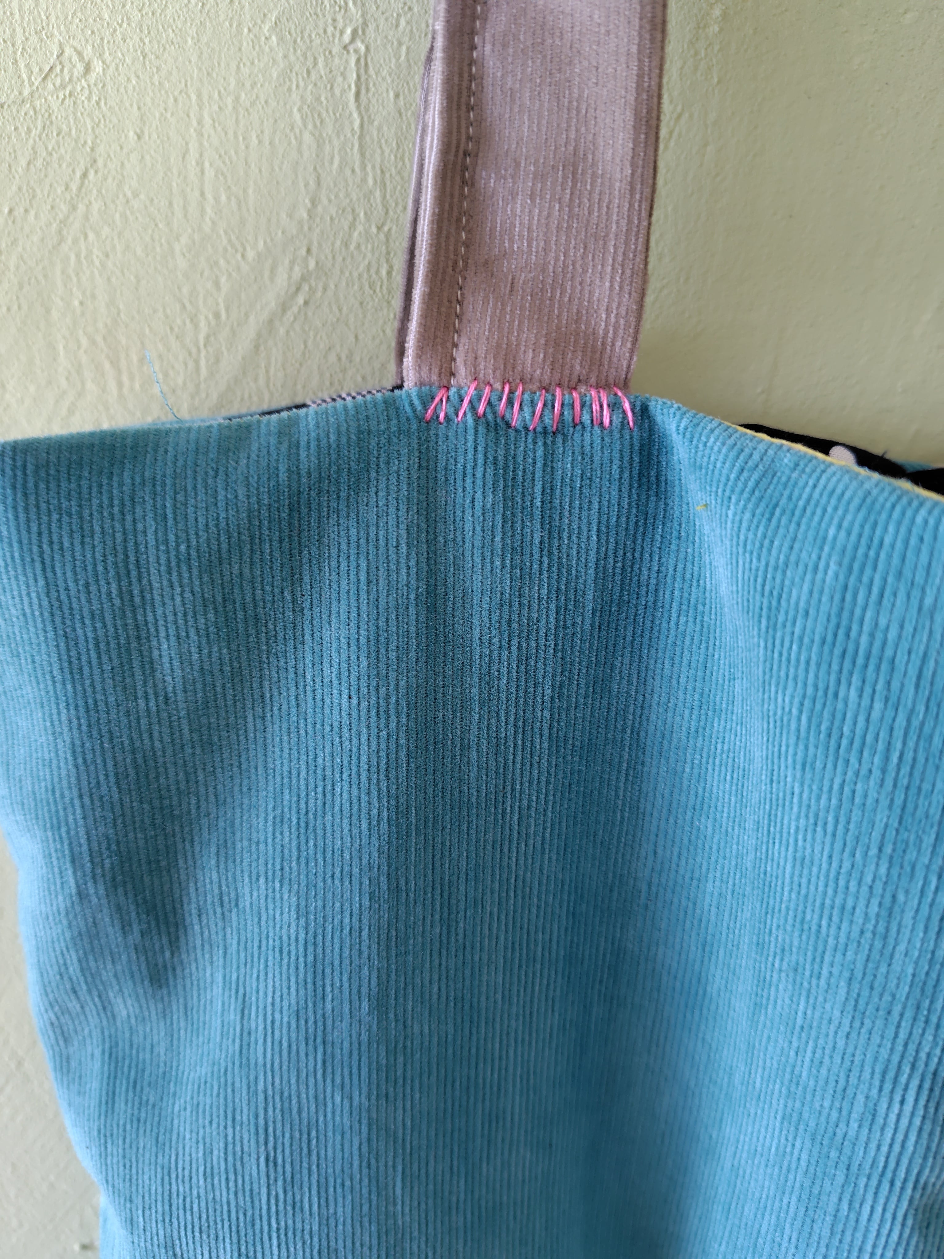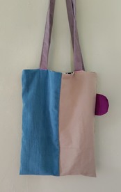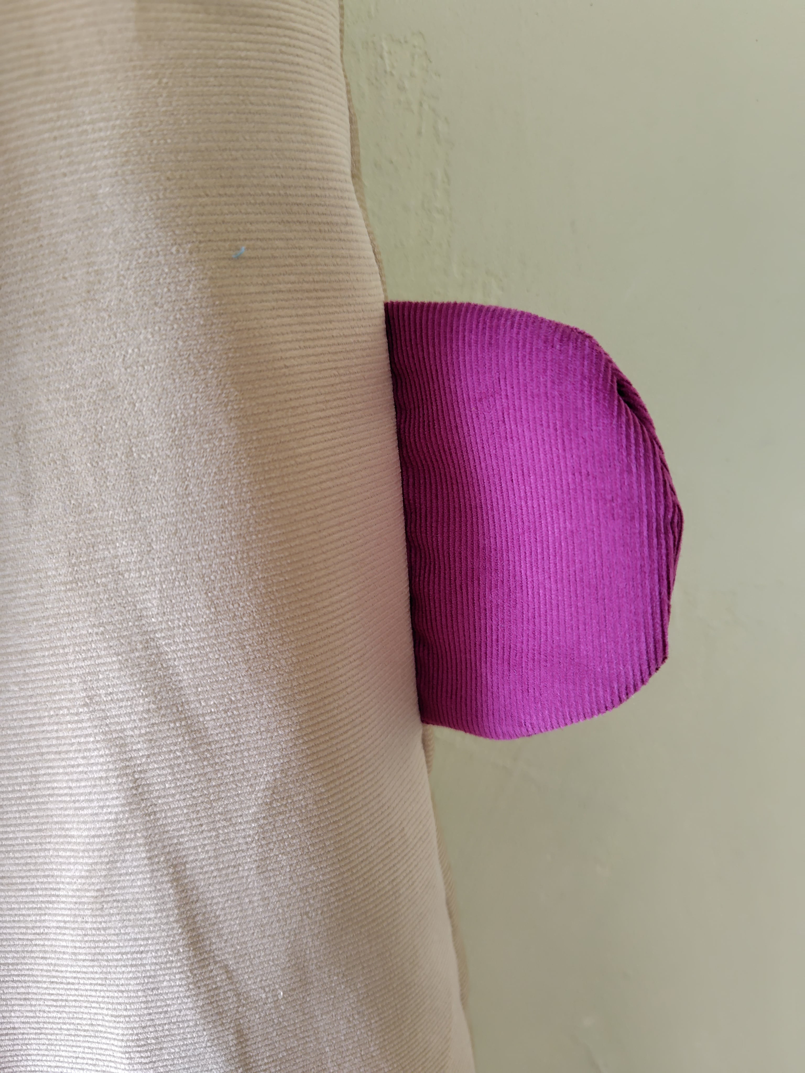 脇には紫色の強いピンク色の半円を挟み縫い付けています。アクセントになっていると思います。