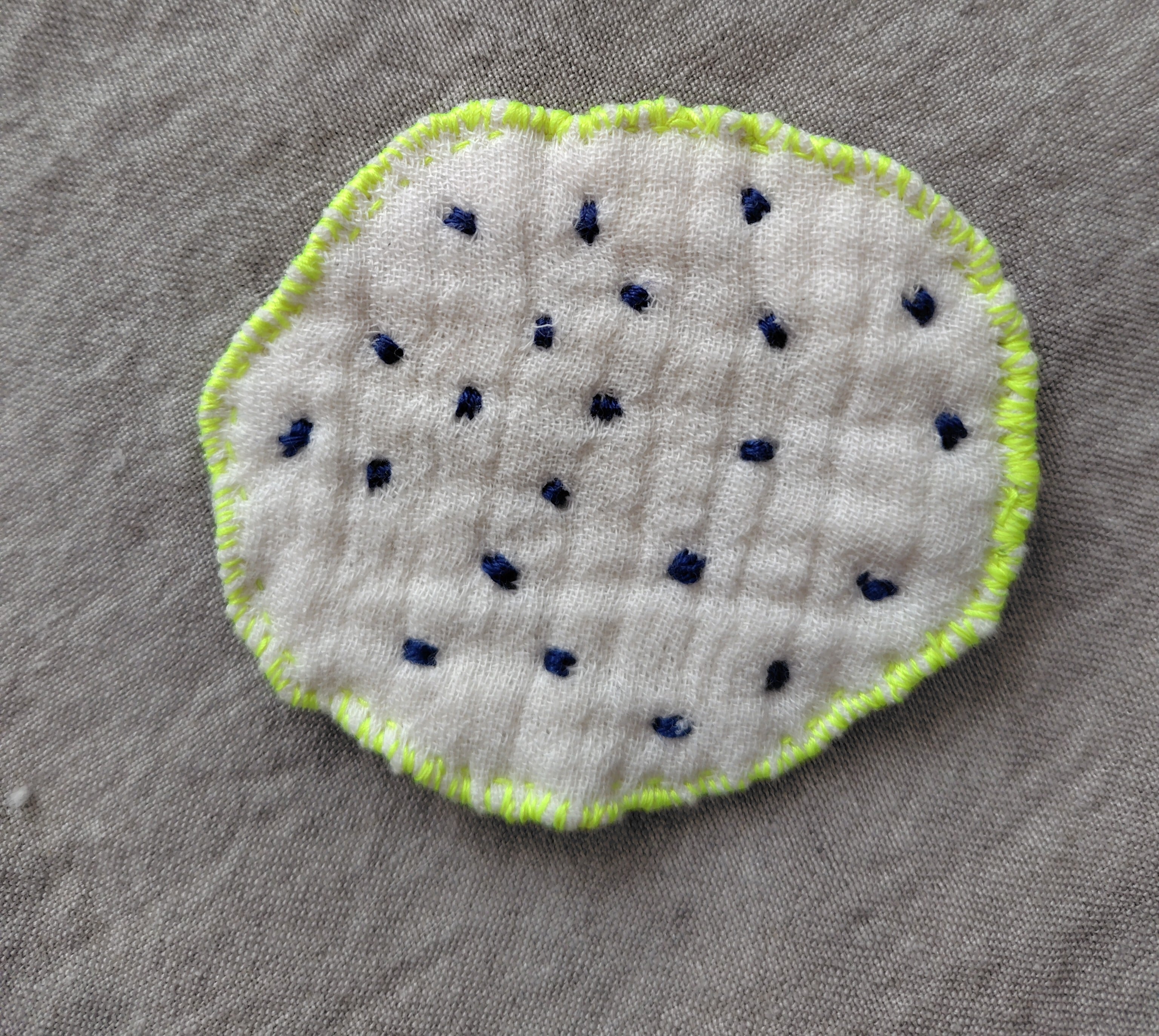 ガーゼ生地に紺の水玉模様を手縫いでいれました。蛍光色の黄色でぐるりと縁取りしたのでポップな印象です。